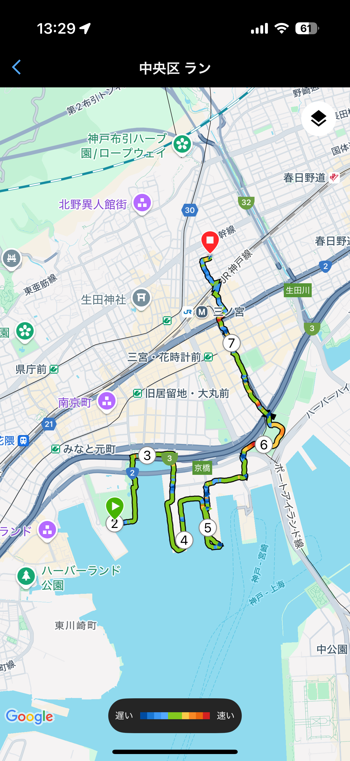 ガーミンのGPSがうまくいかなかったのか、ルートが2キロ地点のメリケンパークからになってます。スタートは神戸駅でした。🚉