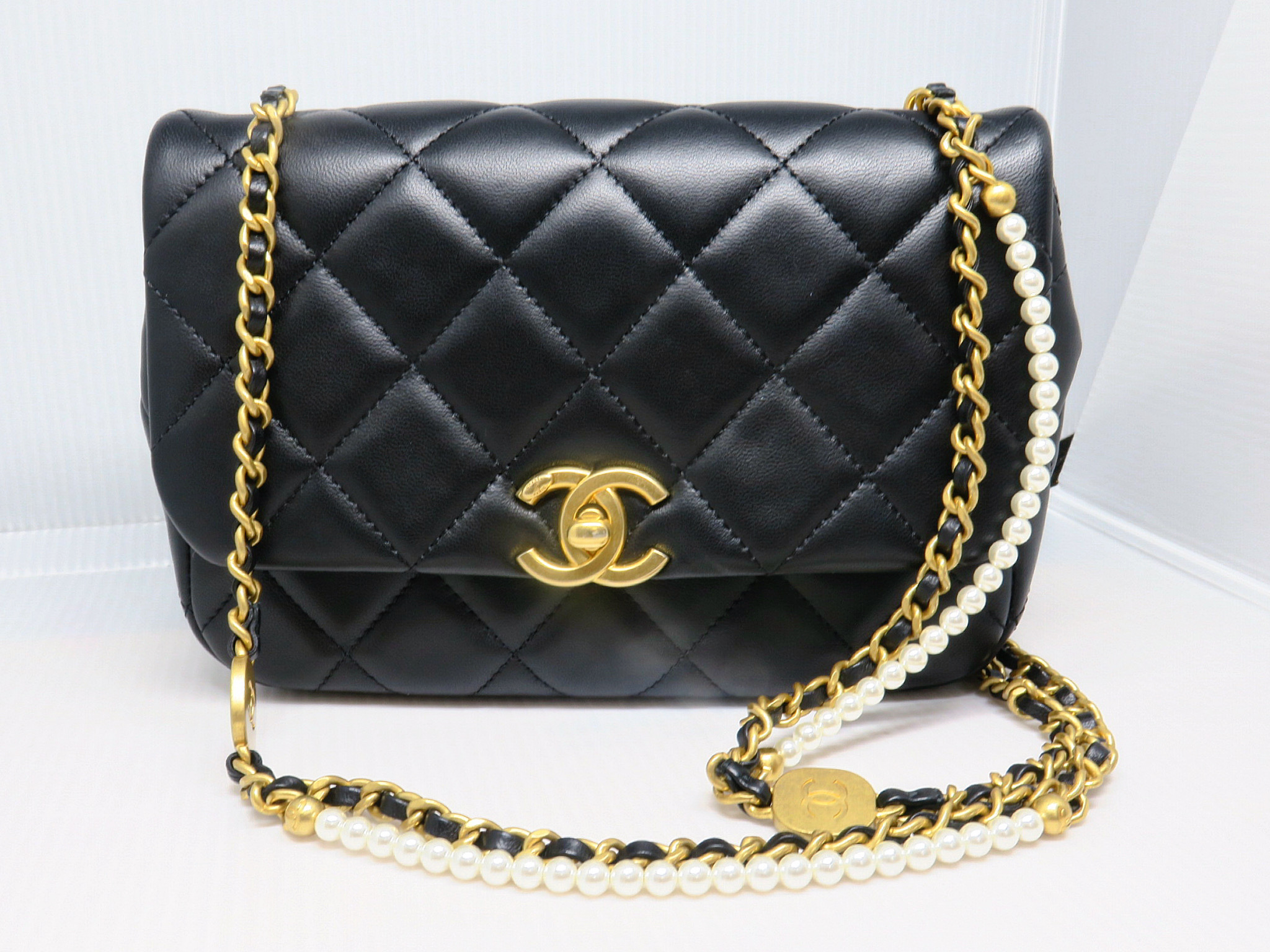 人気のあるミニサイズのフラップバッグ。チェーンのフェイクパールが可愛らしいですね⚪️⚪️⚪️✨お出かけにちょうどいいサイズです。