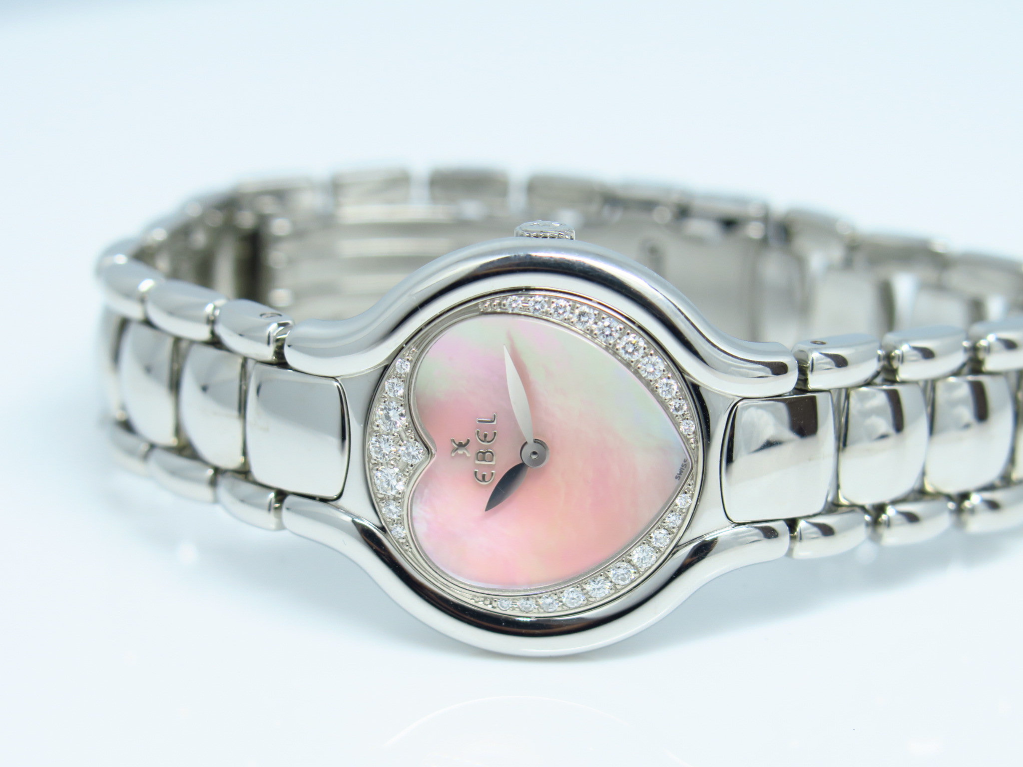 ピンクシェルのハート型文字盤が可愛らしいベゼルにはダイヤモンド