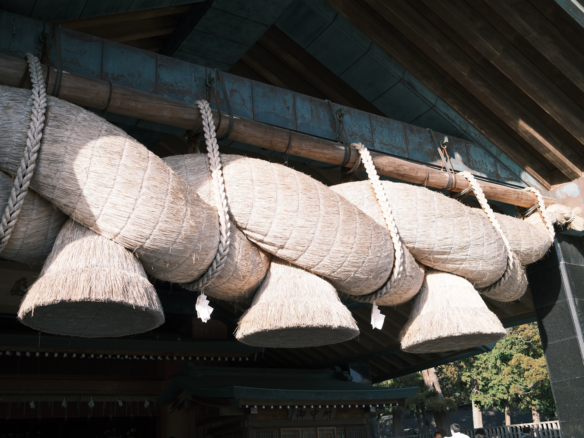 神楽殿に飾られているしめ縄が迫力満点でした。長さ13.6メートル、重さ5.2トンだそうです。